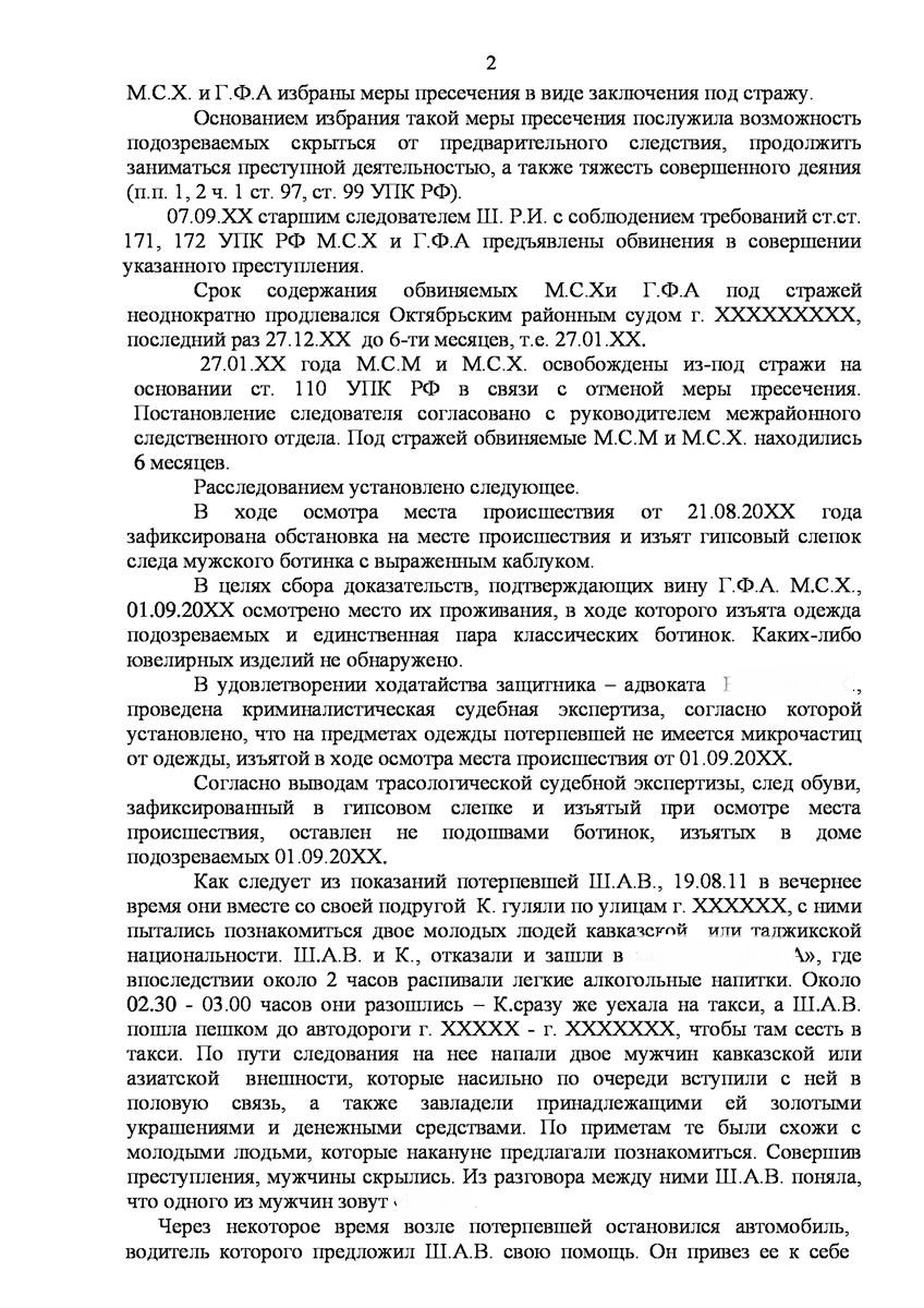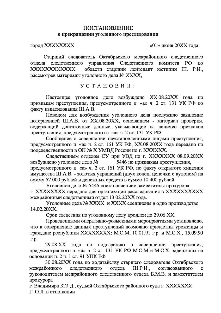 Адвокат в Лосино-Петровске добился прекращения уголовного дела на стадии предварительного расследования по реабилитирующим основаниям в отношении двух граждан иностранного государства обвиняемых органами предварительно следствия в совершении преступления предусмотренного п. «а» ч.2 ст.131 УК РФ (изнасилование совершенное группой лиц) и п."а" , п."г" ч.2 ст.161 УК РФ (грабёж), наказание за которое предусматривает лишение свободы от восьми до пятнадцати лет, то есть преступление, которое в соответствии с ч.5 ст.15 Уголовного Кодекса Российской Федерации отнесено к категории особо тяжких преступлений.